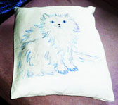 Der Steg dieses Kissens muss nach dem Einkräuseln auf einen Streifen Stoff genäht werden, bevor er eingenäht wird, sonst verzieht sich das Kissen. Das haben wir auch selbst erst beim Ausprobieren gelernt. | Pünktchen, Pünktchen oder Strich! Das kann jeder und immer sieht es gut aus. Stoff- malfarbe, die mit Wasser ver- dünnt werden kann und leicht zu mischen ist, gibt es im Bastelgeschäft. Versuchen Sie es, Sie werden sich wundern, wie begabt Sie sind. | Auch diese Katze ist selbst- gemalt. Es ist nicht so schwer, wie es aussieht. Die Farbe wird nach dem Trocknen gebügelt und hält damit eine kleine Ewigkeit. Auch das vielfache Waschen lässt Ihr Kunstwerk nicht erblassen. |