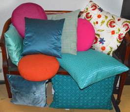 Hier haben wir einen edlen Dekostoff verwendet. Darum herum sehen andere ein- farbige Kissenbezüge am besten aus. |